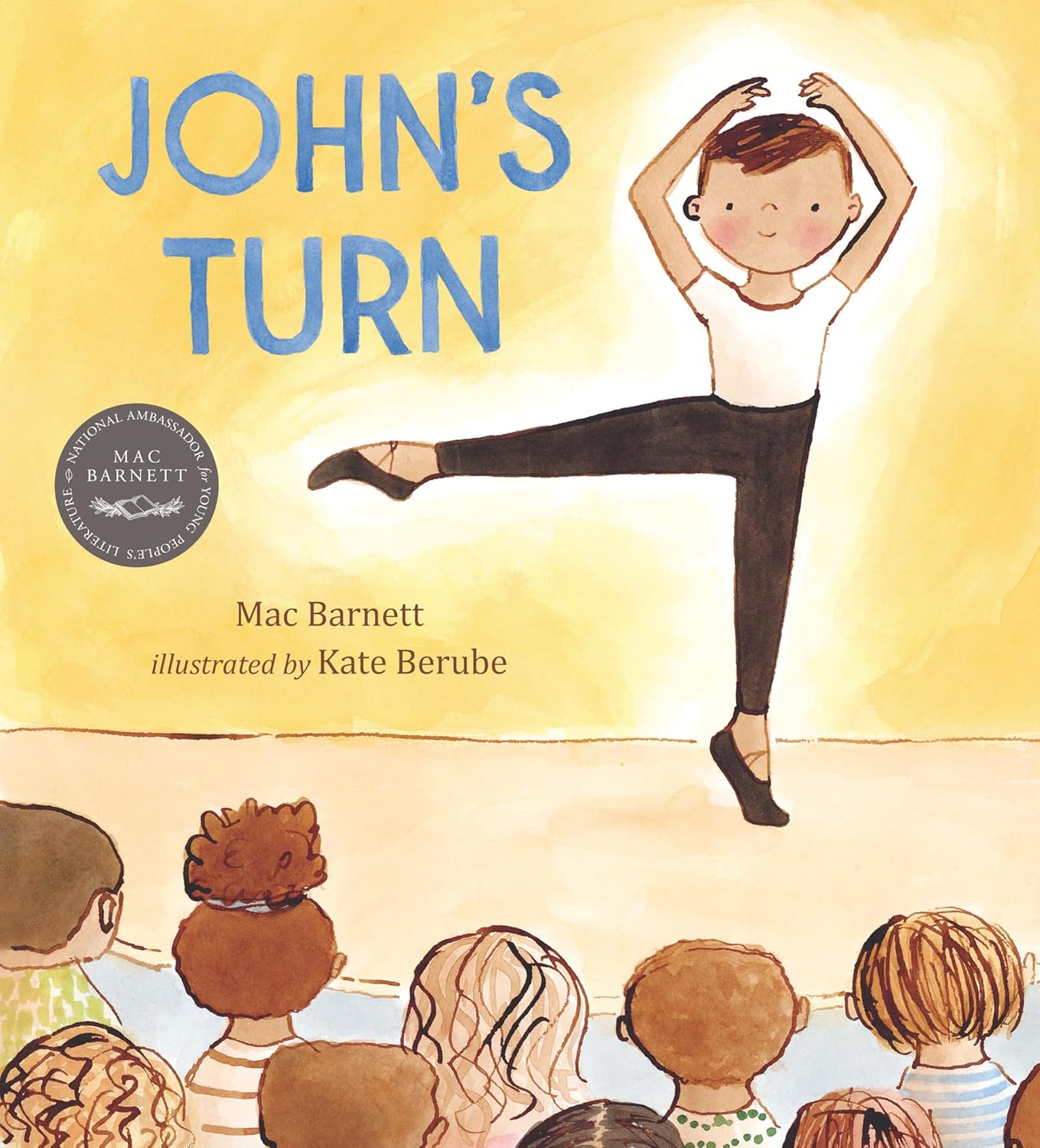 It’s John’s big day at school today—a performance for Sharing Gifts time. His bag is carefully packed and prepared, his classmates are ready, and the curtain is waiting to open. John is nervous, looking out at all the other children staring back at him. But he takes a big breath and begins. Mac Barnett’s compassionate text and Kate Berube’s understated and expressive art tell the story of a kid who finds the courage to show others his talent for dancing.